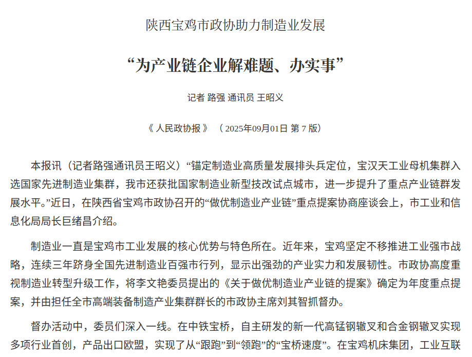 制造业一直是宝鸡市工业发展的核心优势与特色所在。近年来,宝鸡坚定不移推进工业强市战略,连续三年跻身全国先进制造业百强市行列,显示出强劲的产业实力和发展韧性。市政协高度重视制造业转型升级工作,将李文艳委员提出的《关于做优制造业产业链的提案》确定为年度重点提案,并由担任全市高端装备制造产业集群群长的市政协主席刘其智抓督办。
