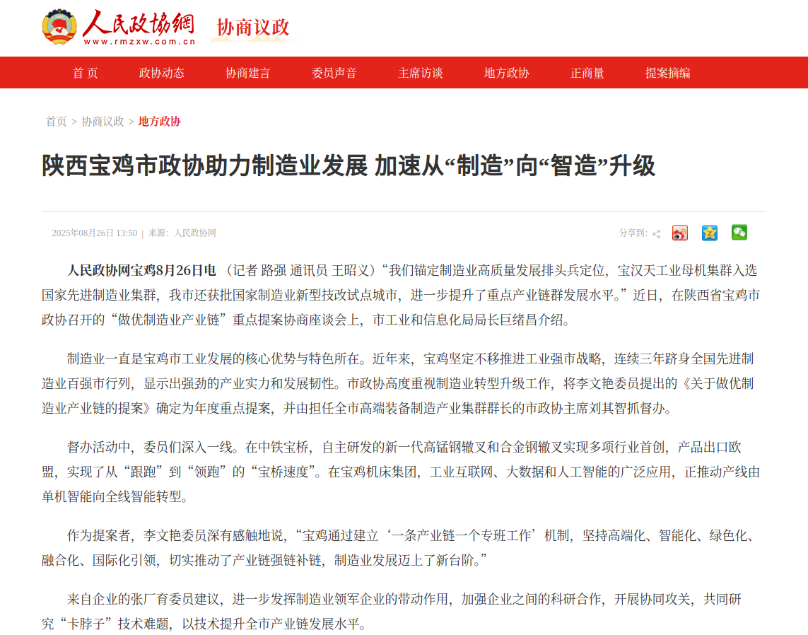 制造业一直是宝鸡市工业发展的核心优势与特色所在。近年来,宝鸡坚定不移推进工业强市战略,连续三年跻身全国先进制造业百强市行列,显示出强劲的产业实力和发展韧性。市政协高度重视制造业转型升级工作,将李文艳委员提出的《关于做优制造业产业链的提案》确定为年度重点提案,并由担任全市高端装备制造产业集群群长的市政协主席刘其智抓督办。